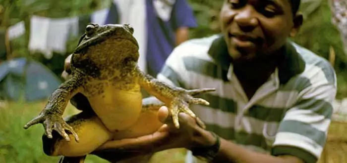 14. El Parque Nacional Monte Alen, situado en la región continental, es un bosque tropical en el que viven gorilas, leopardos, chimpancés, elefantes y cocodrilos entre otros animales. Es un área protegida que ofrece refugio a todos ellos. En este Parque Nacional podrás ver a la rana más grande del mundo. Es la «Rana Goliat». Puede llegar a medir 33 cm. desde el hocico a la cloaca y si le estiras las patas mide ¡80 cm.! Pesa alrededor de 3 kg. y con uno solo de sus saltos cubre una distancia de 3 metros. ¡Bestial!