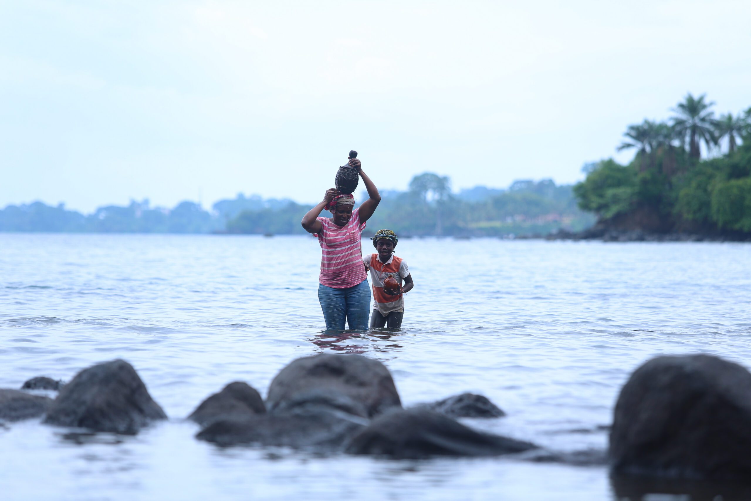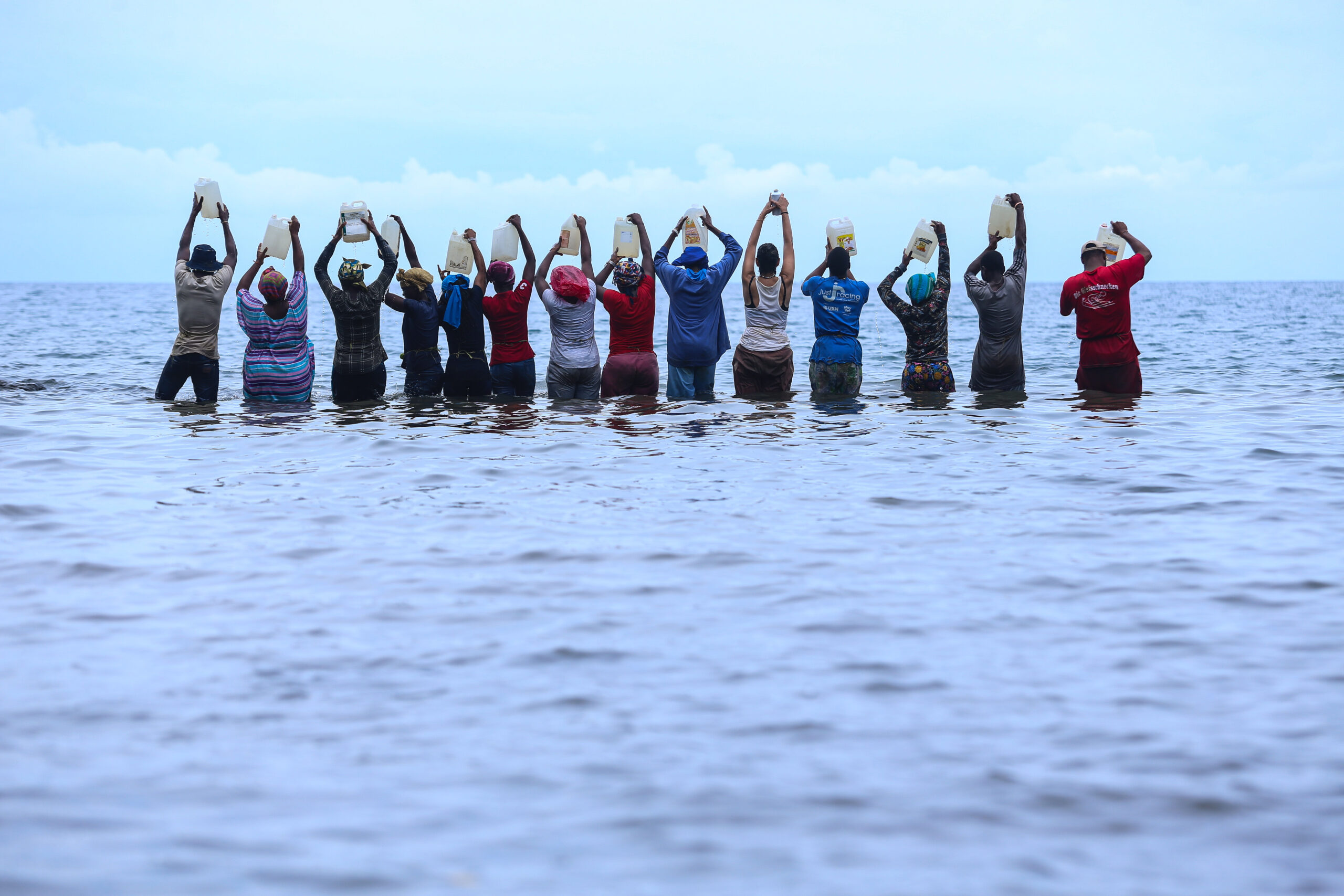 Hombres y mujeres en el mar, elevando sus cántaros al cielo. Imagen de Aquiles Mensa Sité