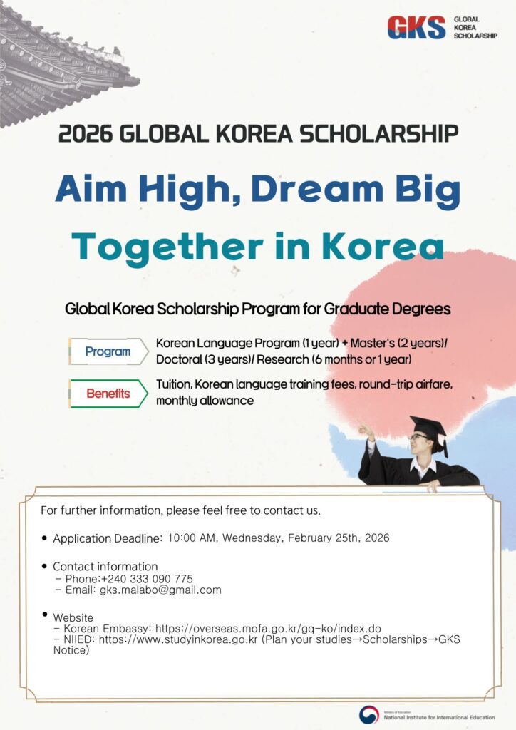 El Programa de Beca Global de Corea(GKS) 2026 (Embassy Track) ha asignado una(1) beca a Guinea Ecuatorial para estudio de posgrado en las universidades surcoreanas para el año 2026