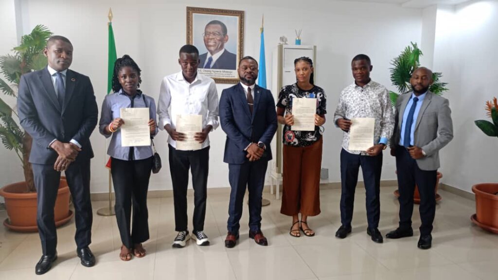 El Ministerio de Educación, a través de la Comisión Nacional Encargado de Estrategia, sobre la Captación, Recepción y Distribución de Becas de Estudio en el Exterior; tras agotar los procedimientos establecidos en las exposiciones de motivos del Decreto Número 110/2019 de fecha 05 de septiembre, sobre la transparencia, equidad e igualdad, para la adjudicación de becas de estudios a favor de los jóvenes ecuatoguineanos; este lunes, el Secretario General de este departamento, Joaquín Ramón Mañe en presencia de varios Directores Generales, ha llevado a cabo la entrega de pasajes a los becarios: Andrés Savio Mba Nsue, Marciorila Avoro Mbenga Nzang, Demetrio Menejal Sabadell y Delicia Filomena Nchama; quienes cursarán sus estudios durante cinco años en las diferentes universidades de Túnez.
