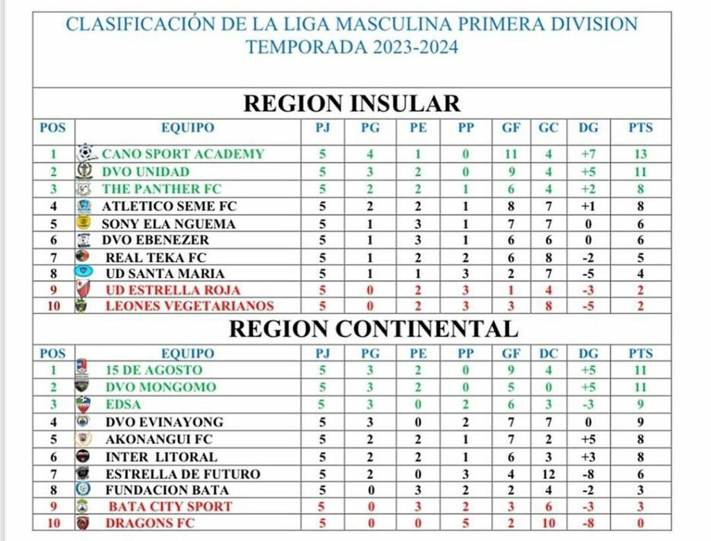 La jornada 5ª de la Liga Nacional llegó a su fin este fin de semana, Cano Sport sigue liderando la tabla de clasificación en la parte Insular con 13 puntos, mientras que el 15 de Agosto lo es en la Continental con 11 puntos, igualado en los puntos con Dvo. Mongomo.