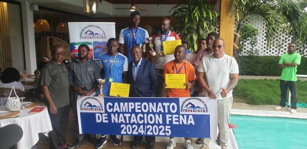La Federación Ecuatoguineana de Natación (FENA), ha concluido su primera edición de la Liga Nacional de Natación con la entrega de trofeos a los campeones de las cuatro modalidades. Este evento se ha desarrollado este sábado, marcando el final de la liga nacional de natación correspondiente a la temporada 2024-2025. La Liga comenzó el 15 de febrero de este año, al inicio contó con la participación de 19 nadadores, aunque no todos han logrado llegar hasta la última jornada de hoy. En esta jornada final, se han llevado a cabo los últimos duelos en la piscina y se han entregado los trofeos a los campeones.