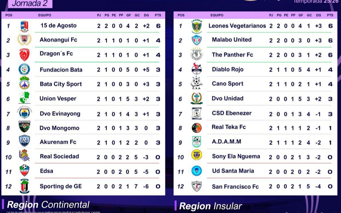 Por otro lado, los equipos Diablo Rojo y Ebenezer, que no lograron victorias en la jornada anterior, finalmente han logrado sus primeras victorias. En cambio, los combinados de Sony Ela Nguema, Santa María, Real Teka y A.D.A.M.M. siguen sin sumar puntos, acumulando solo derrotas o empates. Deportivo Unidad sufrió una dura derrota por 3 a 0 ante Leones Vegetarianos, lo que les ha costado el liderato, actualmente ocupa la sexta posición en la tabla. Malabo United, The Panthers y Leones Vegetarianos continúan con su racha de invictos.