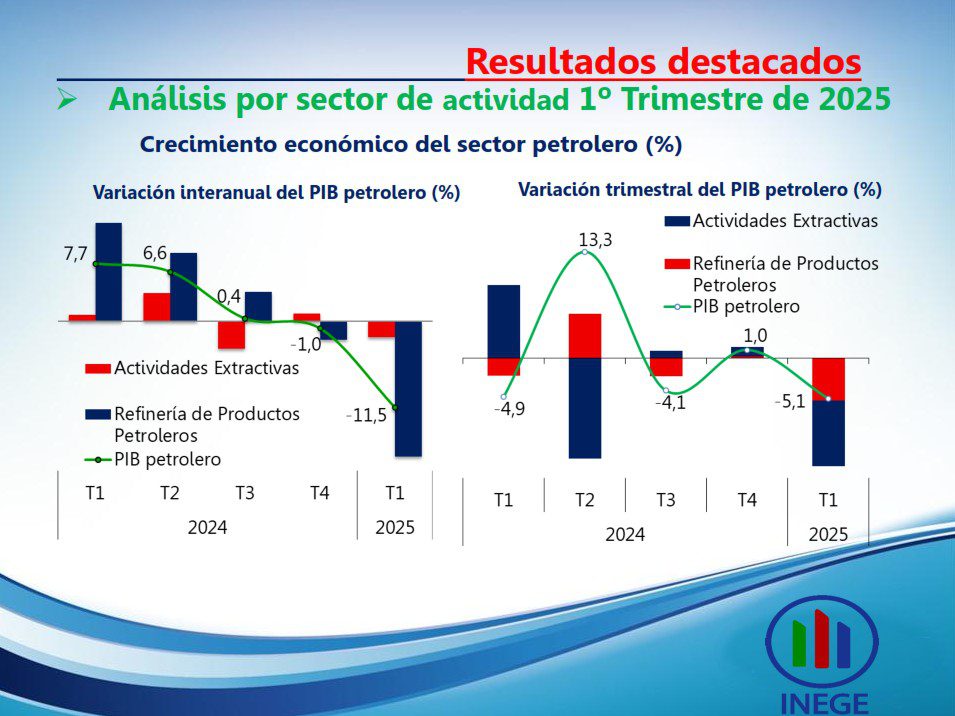 El sector petrolero se contrajo un 11,5% interanual y un 7,0% en comparación con el trimestre anterior. Las actividades extractivas disminuyeron un 2,2% respecto al mismo periodo de 2024 y un 5,3% respecto al cuarto trimestre de 2024, debido especialmente a la caída en la producción de gas seco (condensado), con descensos del 21,6% y del 4,6%, respectivamente. Aunque la producción de crudo aumentó un 4,1% interanual, se redujo un 5,5% en comparación con el cuarto trimestre de 2024.