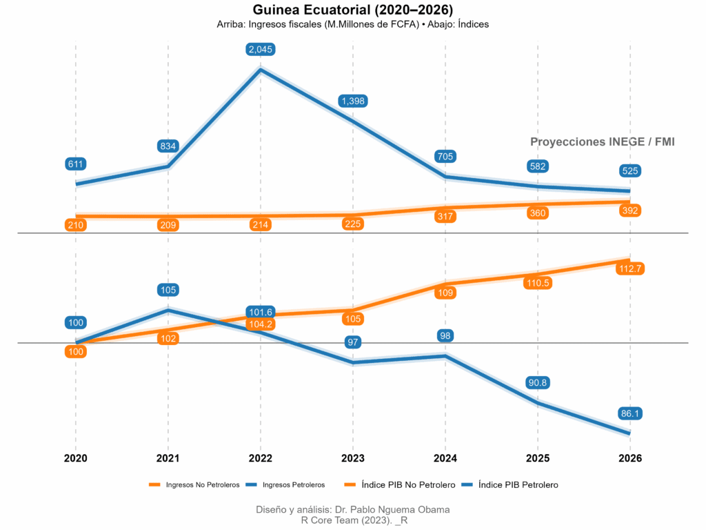 No obstante, el reto estructural sigue presente puesto que el petróleo y el gas representaron todavía el 93,8 % de las exportaciones en 2023, y las previsiones del INEGE alertan de una posible contracción del PIB del 5,5 % en 2025 si la producción de crudo continúa descendiendo. Las proyecciones del FMI refuerzan esta advertencia: los ingresos petroleros mantendrán una tendencia a la baja, lo que obligará al Estado a buscar fuentes fiscales más estables y diversificadas fuera del sector energético.