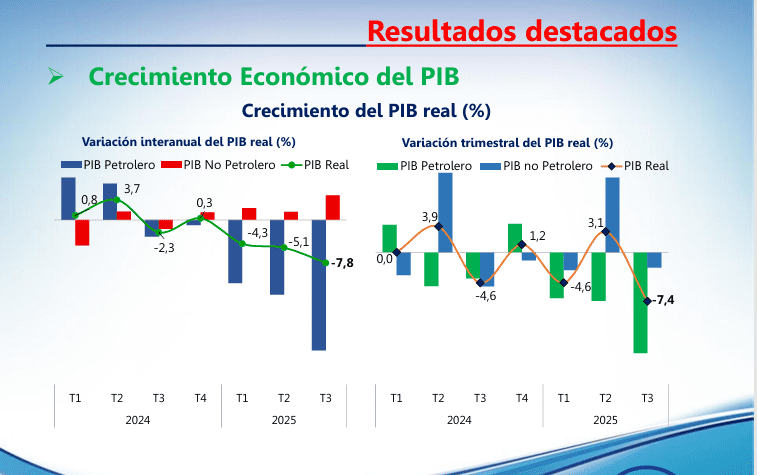 Por su parte, la caída trimestral del PIB en el tercer trimestre de 2025 (-7,4), fue causada tanto por el rendimiento negativo del sector petrolero (-15,3%)´, como del no petrolero (2,3%), explicado por la evolución negativa de las Actividades Extractivas (-12,8%), gases y derivados del petrolero (-17,1%), y los servicios de la Administración Pública y Seguridad Social (-5,5%). Sin embargo, otras actividades como: Comercio, las Actividades Financieras y las de Transporte y Comunicación mostraron variaciones positivas de 5,9%, 1,6% y 2,7% respectivamente