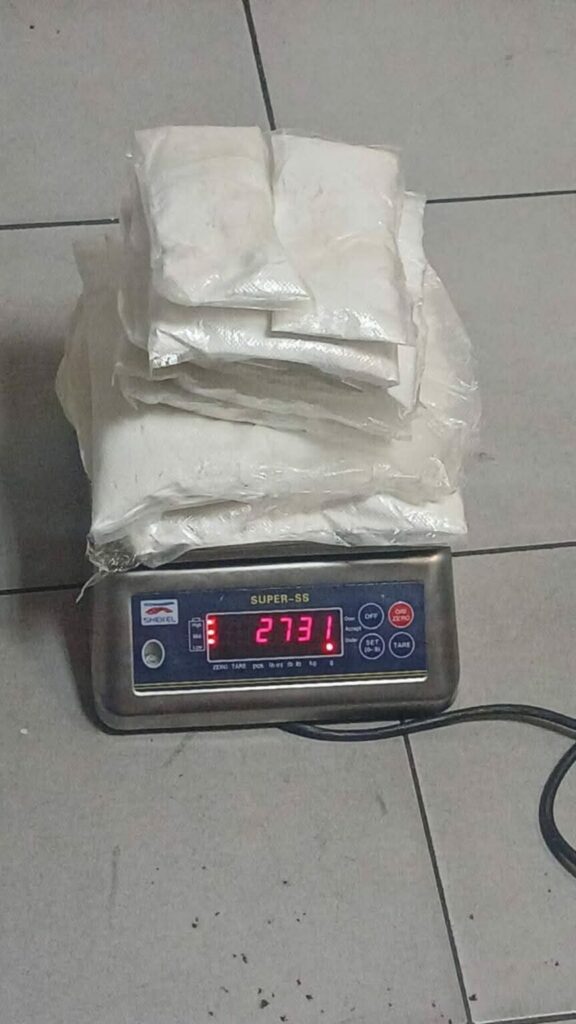 Según las autoridades, el hombre llevaba 2.731 kilogramos de cocaína ocultos en su ropa privada. La sustancia se detectó durante un control de rutina y se confirmó después de las pruebas y el pesaje.