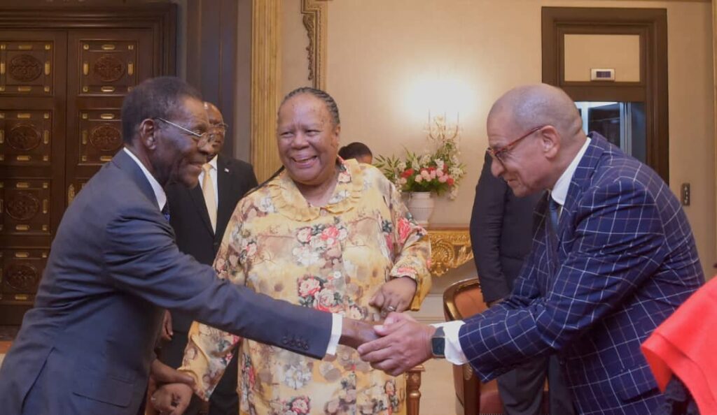 Momento después, los servicios de protocolo introducían en la sala de embajadores a la delegación de la República Sudafricana, encabezada por Grace Naledi Madisa, Ministra de Relaciones Internacionales y Coordinación quien lidera igualmente la alta delegación de Sudáfrica que mantiene reuniones con su homólogo ecuatoguineano, Simeón Oyono Esono Angue. Recientemente, ambos Ministros han firmado sendos Acuerdos Marco de Cooperación para seguir reforzando las relaciones diplomáticas entre Malabo y Pretoria.