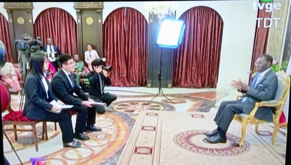 El Jefe de Estado y de Gobierno, Obiang Nguema Mbasogo ha cerrado su agenda de este miércoles concediendo una entrevista al medio de comunicación público de la República Popular China, para hablar sobre la cooperación entre Guinea Ecuatorial y China, así como las turbulencias que conoce actualmente el panorama político mundial o la visión de Guinea Ecuatorial de cara al horizonte 2035 entre otros temas. El Jefe de Estado ha felicitado a su homólogo Chino por la ayuda que proporciona a los africanos, para superar los obstáculos que frenan el desarrollo de sus pueblos. La cita ha tenido lugar en el Palacio del Pueblo de Malabo en presencia del Ministro Encargado de Misiones a la Presidencia de la República, Alejandro Evuna Asangono, y el Ministro del Gabinete Civil, Job Obiang Esono Mbengono.