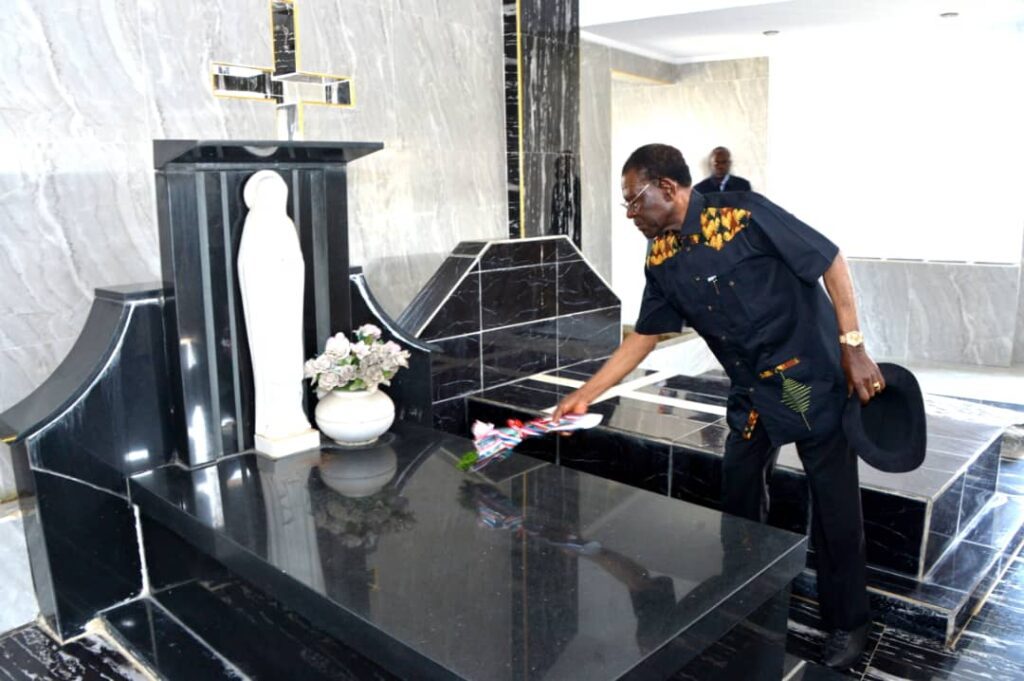Con un profundo sentimiento de unidad familiar que caracteriza estas fechas del adviento del Niño Jesús, el recorrido de la pareja presidencial consistió en la colocación de ramos de flores sobre las tumbas de sus seres queridos. La ceremonia comenzó en la localidad de Acoakam-Esangui, pueblo natal del Jefe de Estado y de Gobierno, donde yacen los restos mortales de su madre biológica, María Mbasogo Ngui, así como los de José Eneme Ona y el hijo de Manuel Mbaga, todos familiares directos del presidente.