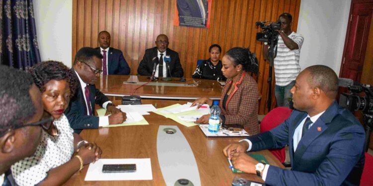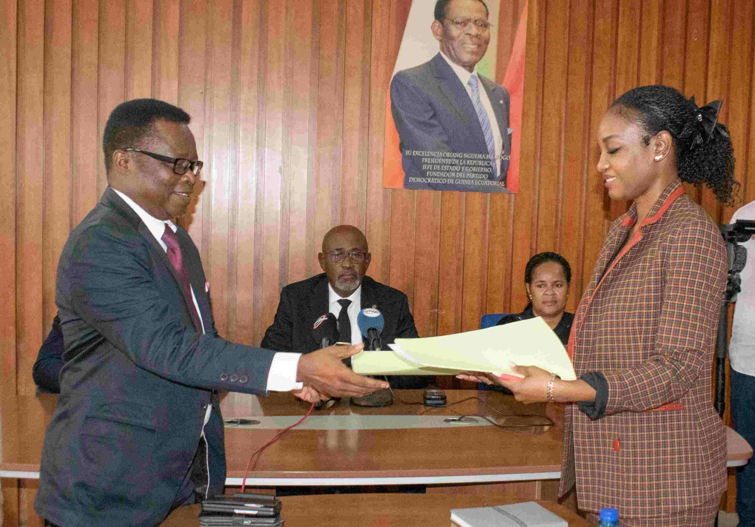El Viceministro de Agricultura, Encargado de Pesca y Recursos Hídricos, Juan NKO MBULA, en representación del Ministro, ha presidido hoy en Malabo 2, el acto de entrega de despacho entre el Director General de la Sociedad Nacional de Pesca de Guinea Ecuatorial (SONAPESCA) saliente y los directores entrantes: Manuela Nchama Mba (Directora General) y Priscilo Tobías Nzang Nzo Andeme (Director General Adjunto). El acto también ha contado con la presencia del Presidente del Consejo de Administración de SONAPESCA, y la Consejera de este departamento ministerial.