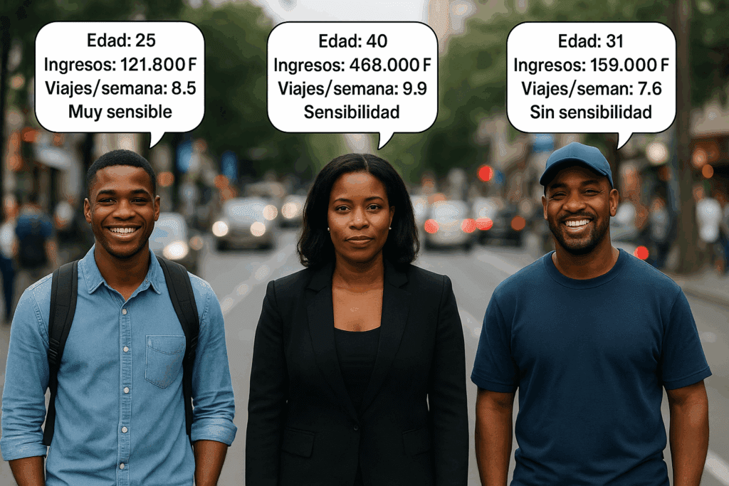 Los datos revelan tres perfiles principales, están los jóvenes estudiantes y trabajadores informales con ingresos mensuales de unos 121.800 XAF que realizan aproximadamente 8,5 viajes semanales, representan el grupo más sensible al precio. Están los adultos empleados formales con mayor estabilidad económica (ingresos aproximados de 468.000 XAF) y realizan cerca de 9,9 viajes semanales, los cuales soportan mejor los aumentos de coste. Y la clase media joven con ingresos intermedios cercanos a 159.000 XAF, muestran una sensibilidad moderada y utilizan el taxi para ir a trabajar y motivos que llamaron personales para sus trayectos.