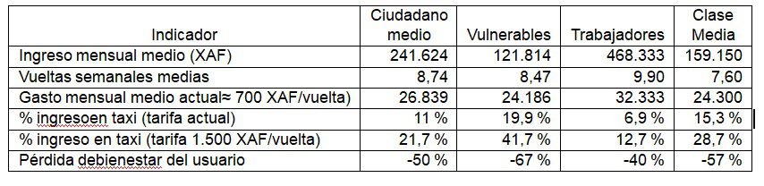 Según los resultados extraídos del estudio, el usuario medio destina actualmente alrededor del 11 % de su ingreso mensual al taxi, una cifra que podría duplicarse si se ajusta la tarifa por trayecto para cubrir el nuevo coste del combustible que supondría aumentar 150XAF el litro de combustible.