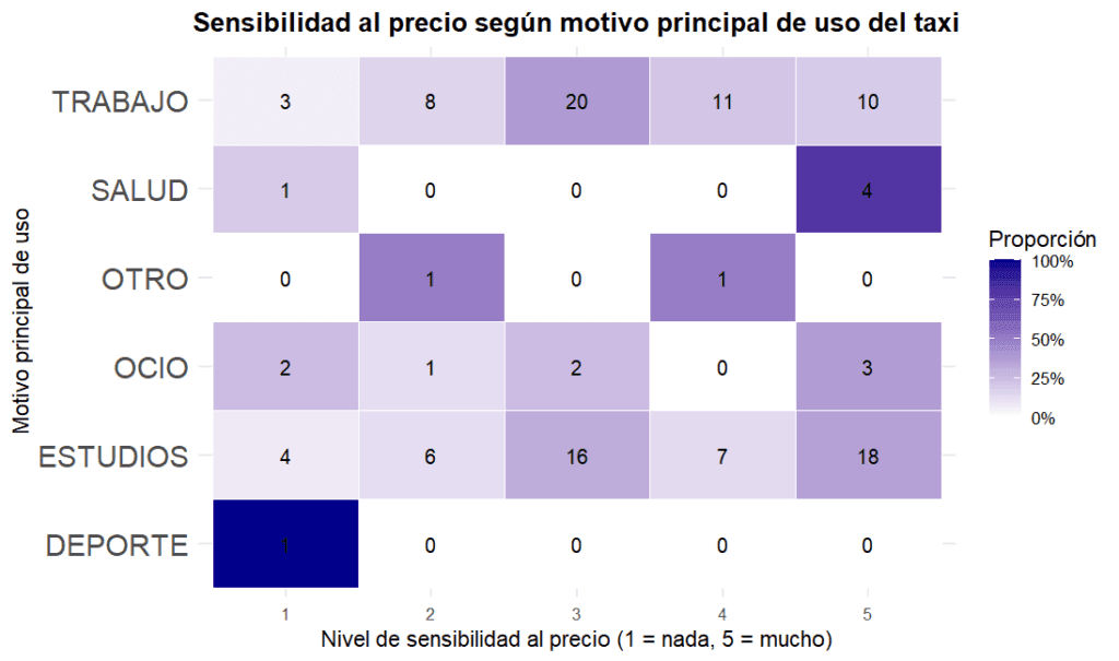 Los resultados indican que el 65 % de los usuarios sin alternativas (como vehículo propio o transporte institucional) afirman que reducirían el uso del taxi ante una subida de precio, que como se analizó anteriormente, sería a la mitad, y esta reducción se sustituiría por caminar o, en menor medida, al transporte público (autobús urbano), cuando esté disponible. Además, las razones por las que usan este medio de transporte marcan diferencias claras quienes utilizan el taxi por razones de estudio o salud presentan mayor sensibilidad al precio que quienes lo hacen por ocio o conveniencia.