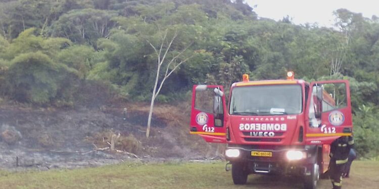 Un incendio forestal registrado en Evinayong calcinó alrededor de 1.500 metros de terreno bajo una línea de alta tensión. Según el cuerpo de bomberos, el fuego se originó cuando un vecino intentaba quemar su finca y se propagó más de lo previsto.