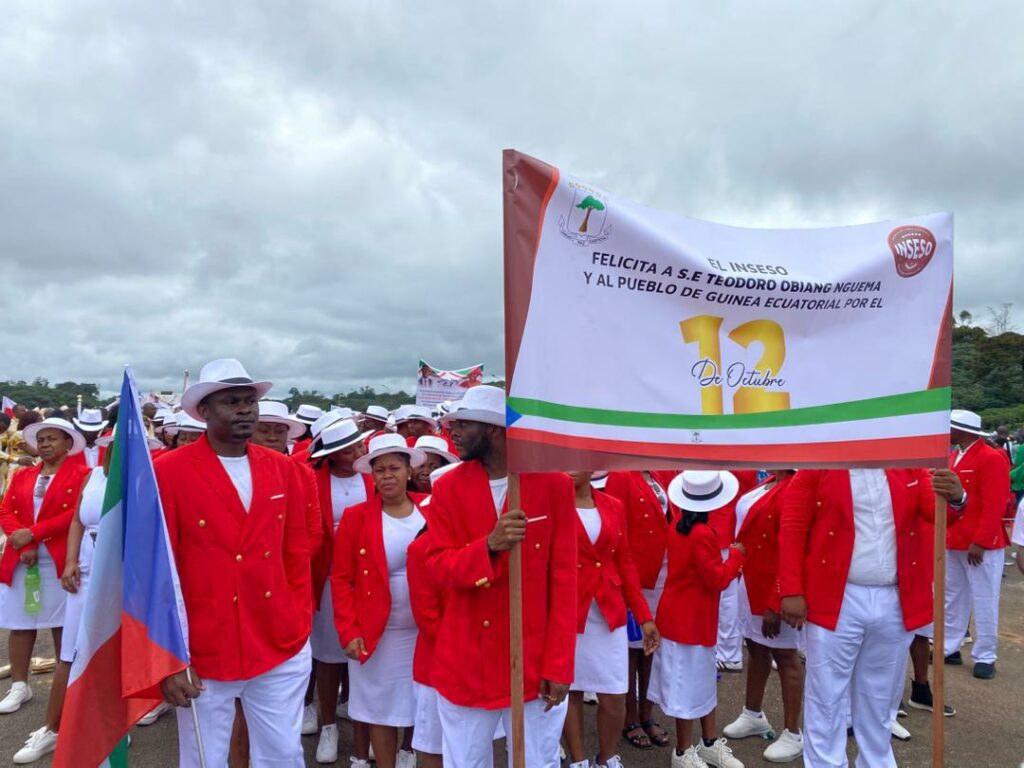 El personal del INSESO, encabezado por su Delegado Nacional, Moisés Angüe Nso Nchama, desfiló ayer uniformemente con los nuevos colores de la institución. Con paso firme e izando las banderas del país y del INSESO los trabajadores desfilaron frente a las autoridades nacionales y la ciudadanía, reflejando el espíritu de unidad, patriotismo y responsabilidad institucional.