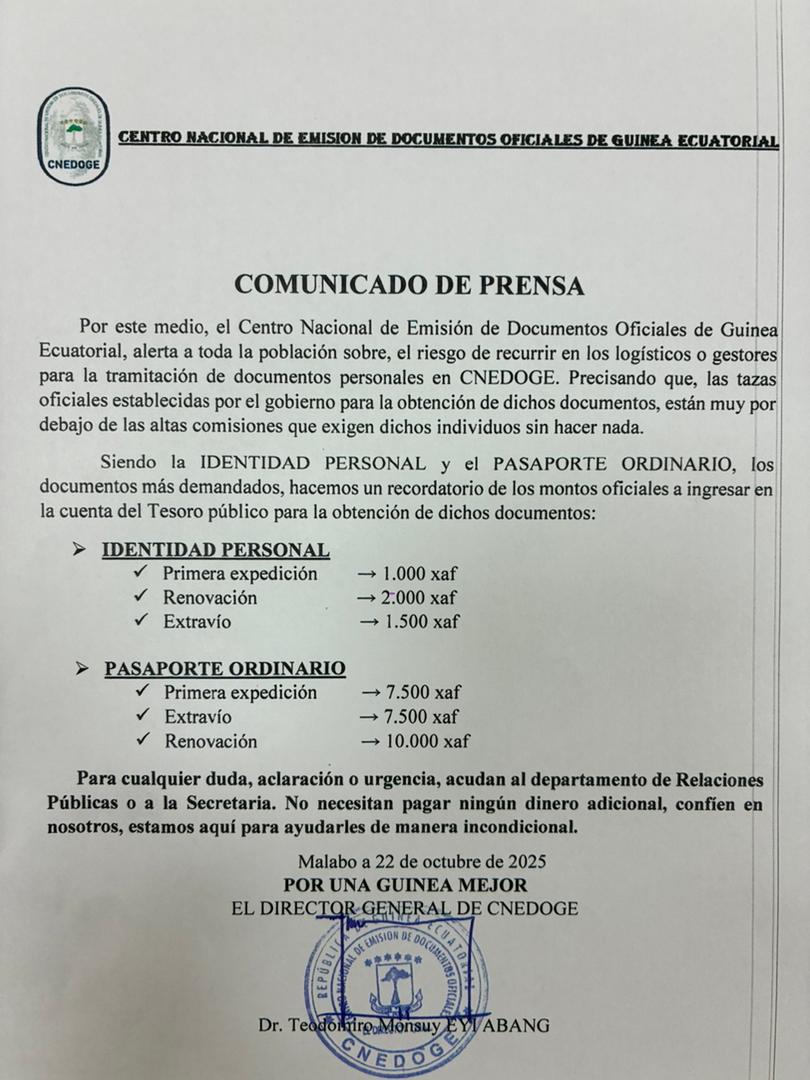 El Centro Nacional de Emisión de Documentos Oficiales de Guinea Ecuatorial (CNEDOGE), alerta a toda la población, sobre el riesgo de recurrir a los logísticos o gestores para la tramitación de documentos personales en CNEDOGE, precisando que las tasas oficiales establecidas por el gobierno para la obtención de dichos documentos, están muy por debajo de las altas comisiones que exigen dichos individuos sin hacer nada.