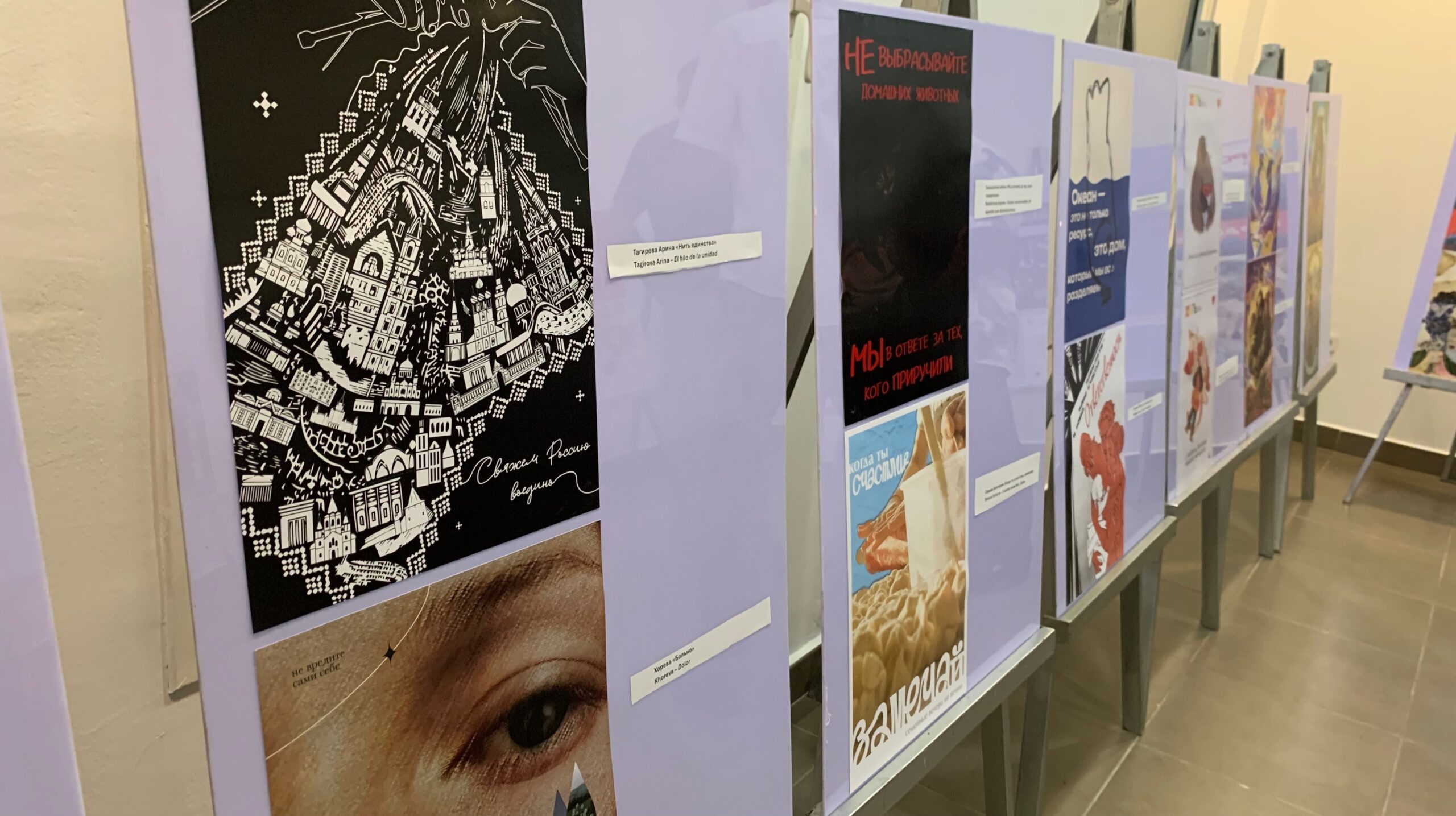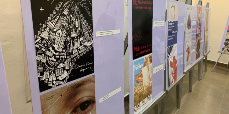 Las obras expuestas forman parte de un concurso sobre arte del cartel que narra temas actuales y de interés general, organizado en Rusia.