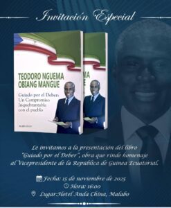 La presentación oficial del libro “Guiado por el Deber”, que rinde homenaje al Vicepresidente de la República de Guinea Ecuatorial, Nguema Obiang Mangue, está programada para el 15 de noviembre de 2025, a las 16:00 horas en el hotel Anda China de Malabo. La obra, que destaca el liderazgo y la figura del vicepresidente, se presenta como un compendio de su compromiso con el desarrollo y la estabilidad del país.