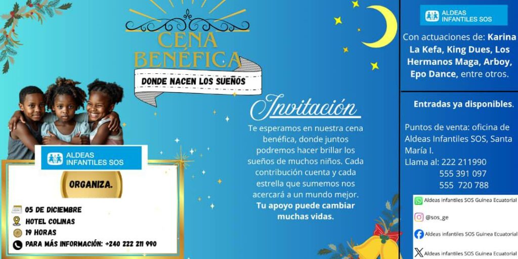 Compra tus entradas en la Oficina de Aldeas Infantiles SOS Malabo; 📍Santa María 1 ; detrás del cuartel Acacio Mané Ela. Para más información pueden llamar a los teléfonos: (+ 240) 555 720 788 // 555 39 10 97 // 555 51 79 43 // 222 869 012.