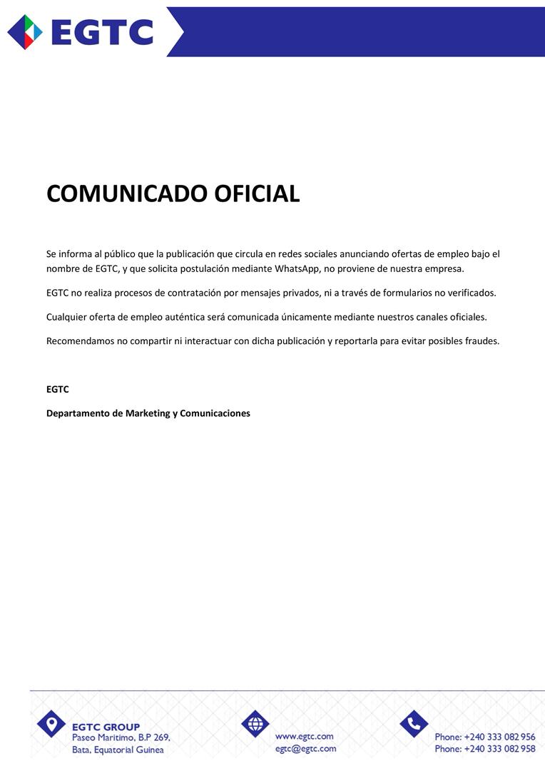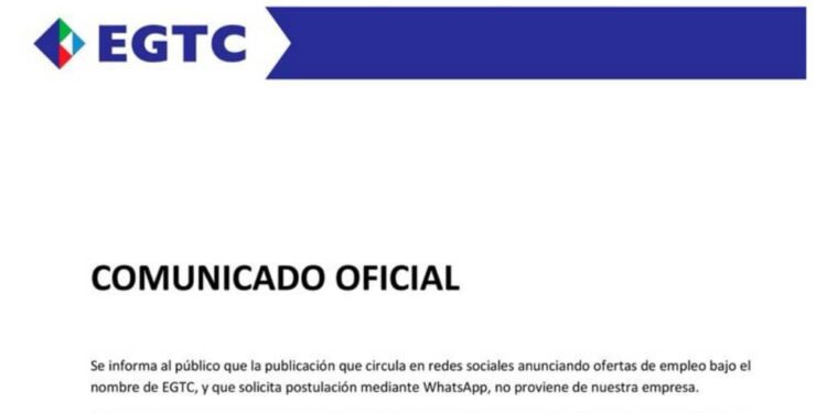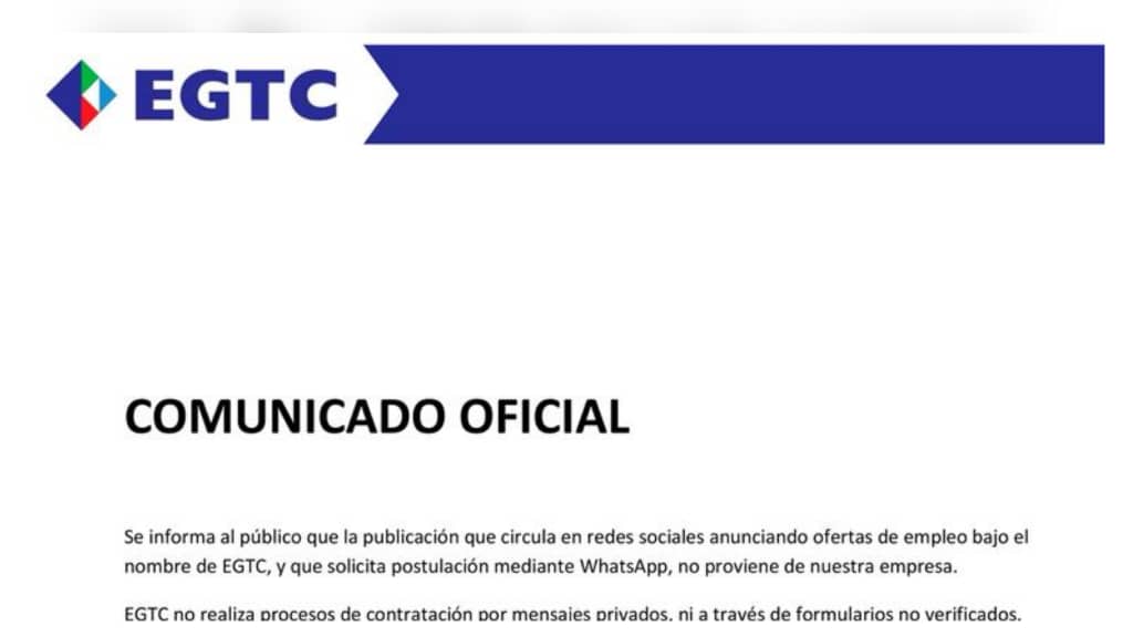 En un Comunicado Oficial, la empresa EGTC informa al público que la publicación que circula en redes sociales anunciando ofertas de empleo bajo el nombre de EGTC, y que solicita postulación mediante WhatsApp, es falsa.