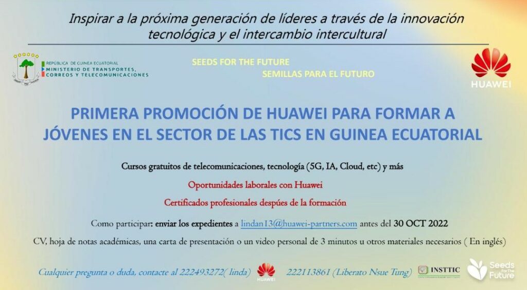 «Semillas para el Futuro» es un programa mundial y emblemático de Huawei, lanzado en 2008. Su objetivo es desarrollar el talento local especializado en las TICs y tender puentes de comunicación entre países y culturas. El programa proporcionará a los participantes de Guinea Ecuatorial cursos gratuitos en línea, en materia de telecomunicaciones, últimas tecnologías (5G, IA, nube), cultura china, etc.