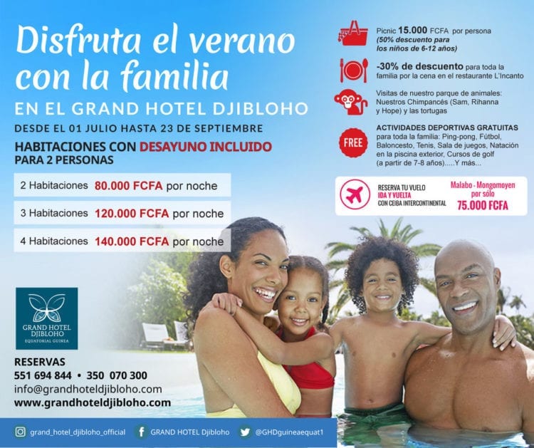 Se trata de una oferta muy interesante, en la que se incluyen todos los servicios del Hotel Djibloho , Spa, Golf, Discoteca, Piscina, etc. Con el objetivo de promover en gran medida la cultura hotelera y cambiar el concepto que tienen algunos ciudadanos a cerca de los hoteles.